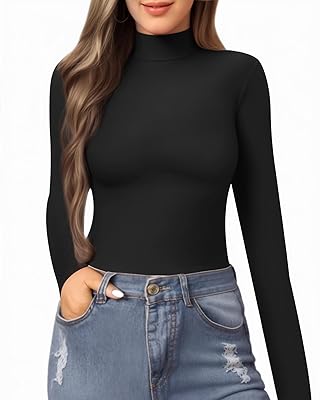 A sleek, black turtleneck bodysuit offers a smooth, tucked-in look. It’s a wardrobe essential for 2025.