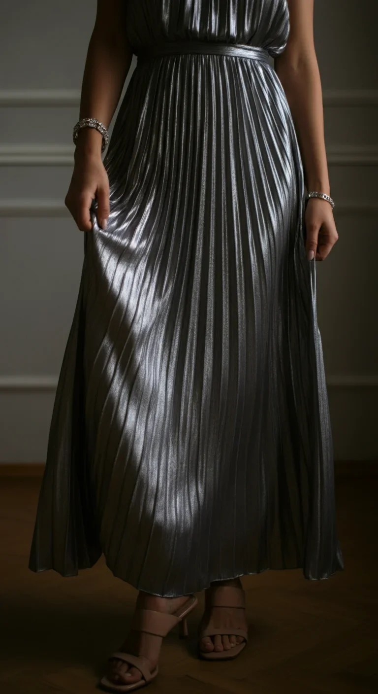 Buy on AmazonA shimmering silver maxi dress, featuring elegant pleats and a metallic finish, reflects light with stunning brilliance.