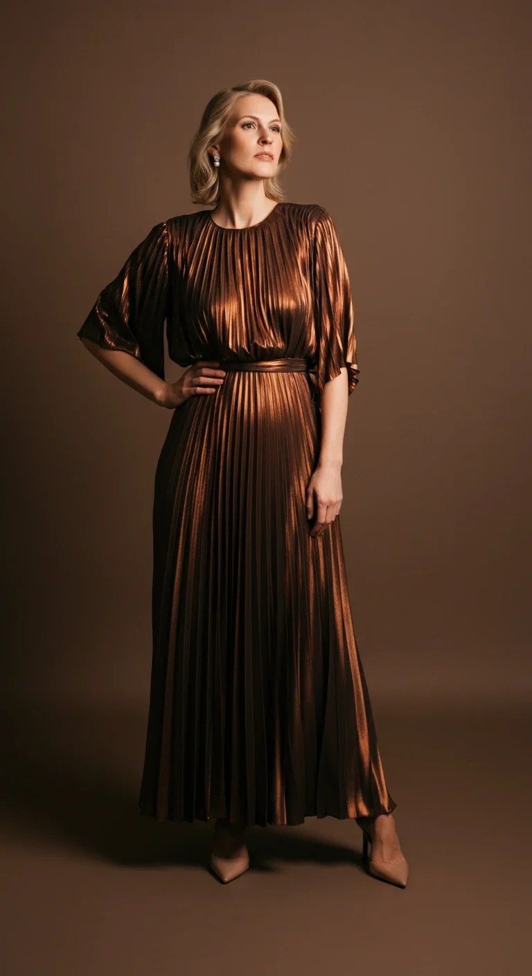Buy on AmazonThis bronze gown features a stunning plissé metallic finish. The design creates captivating texture and fluid movement.