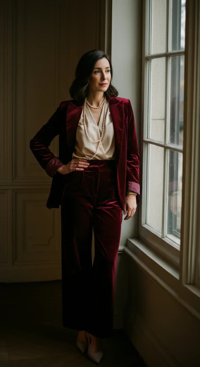 Ditch the usual dress! Opt for a stunning velvet pantsuit in rich burgundy for a modern, luxurious look.