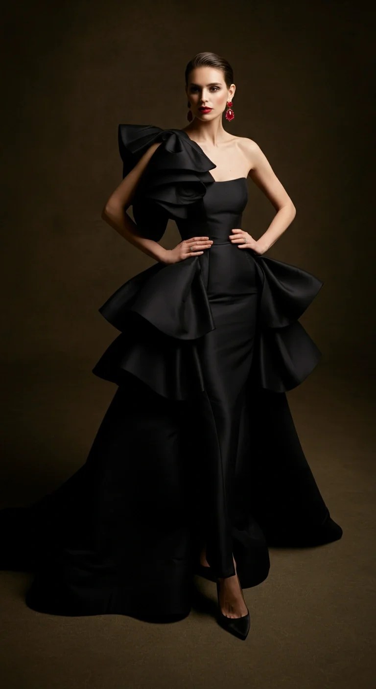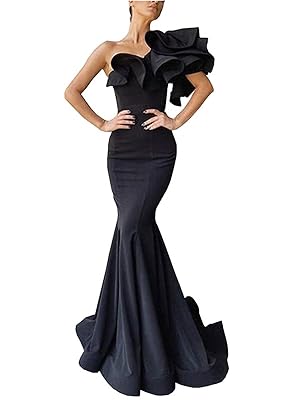 Buy on AmazonA striking black gown, reaching the floor, features bold, architectural ruffles for a dramatic effect. This design is a modern statement.
