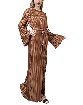 Buy on AmazonA shimmering silver maxi dress, featuring elegant pleats and a metallic finish, reflects light with stunning brilliance.
