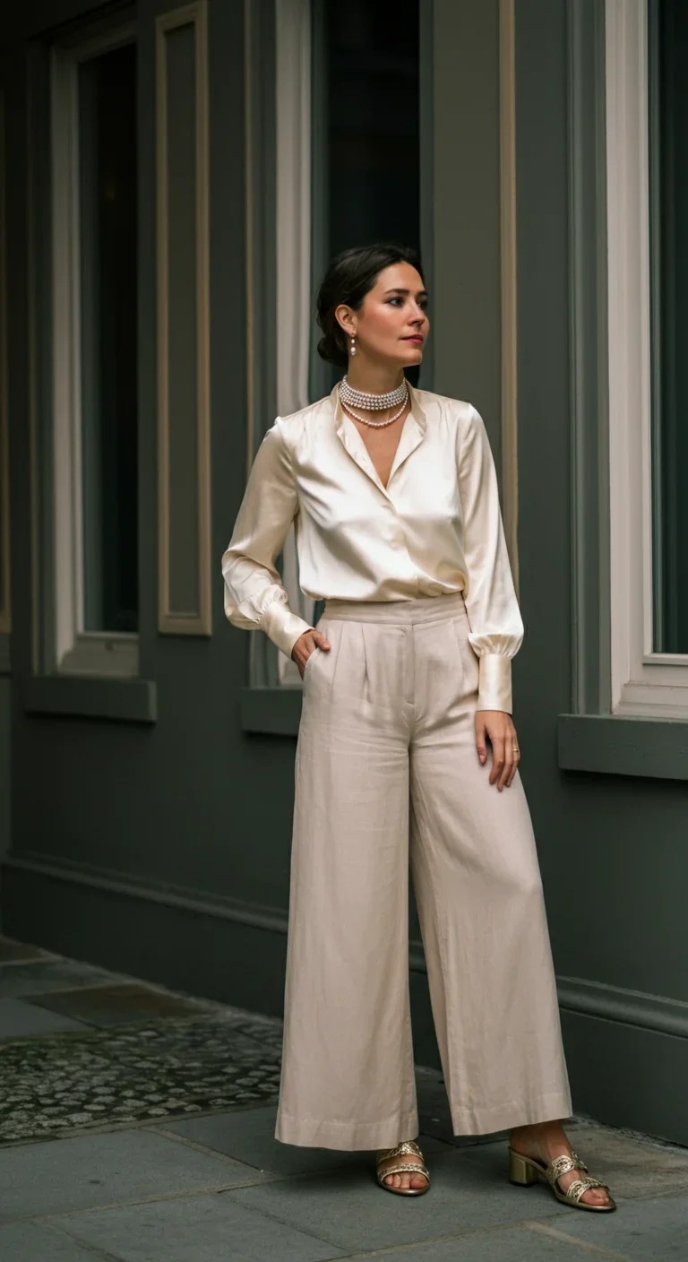 Buy on AmazonA creamy silk blouse, matched with wide-leg palazzo pants, offers simple sophistication in 2025.