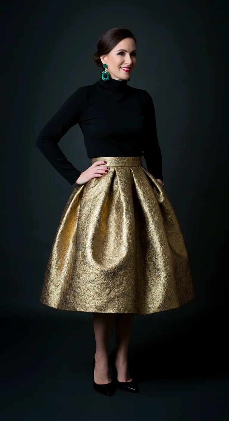 Buy on AmazonA shimmering gold brocade ball skirt, matched with a sleek black turtleneck, creates a timeless yet modern look.