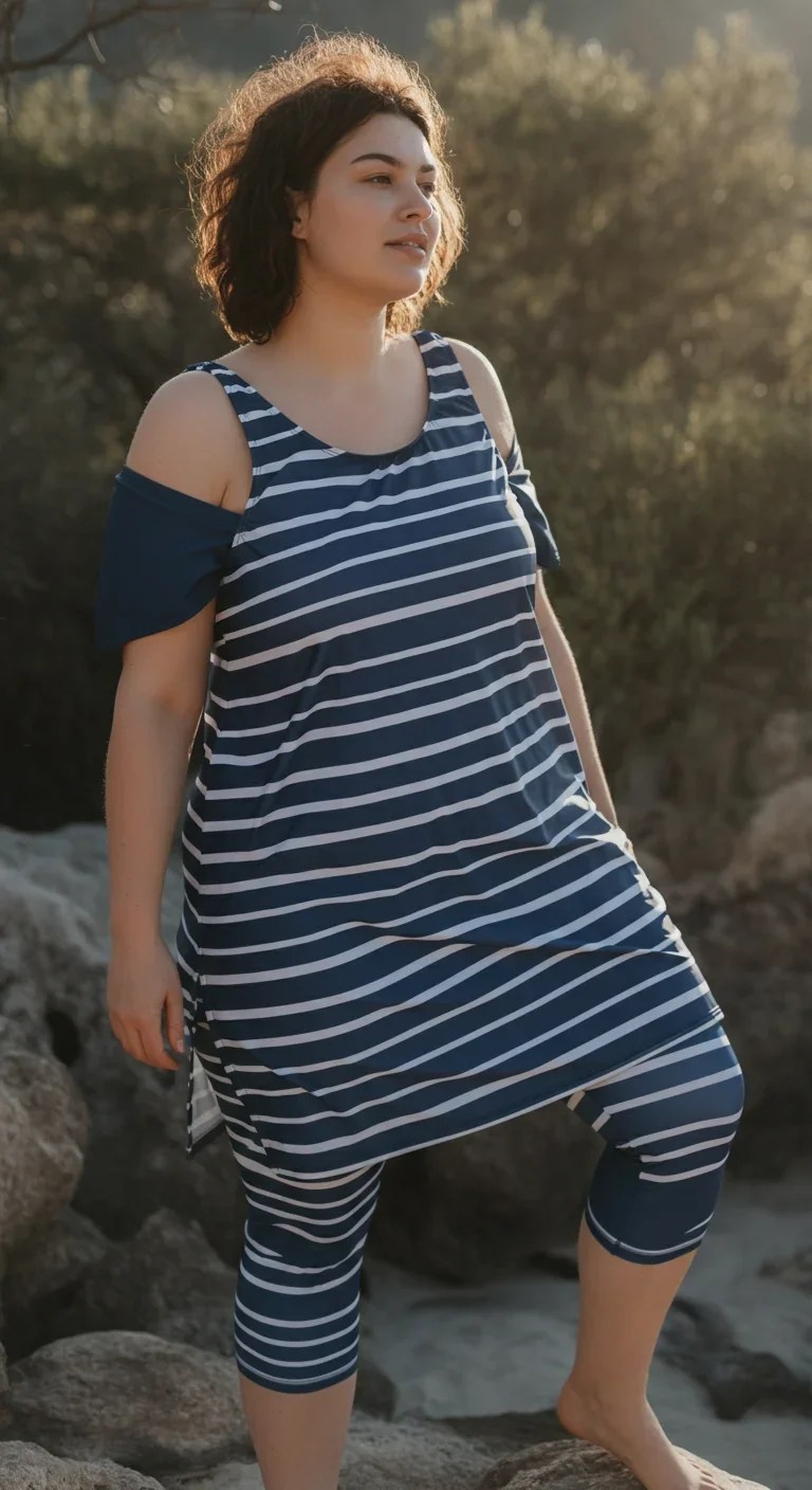 This stylish navy and white striped swim dress comes with matching cropped leggings.