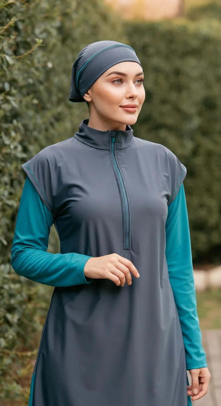 Buy on AmazonThis modern burkini showcases a stylish charcoal base, enhanced with vibrant teal highlights.