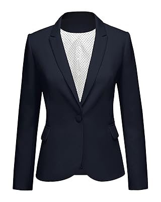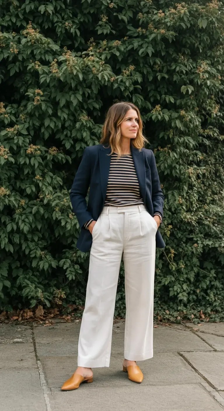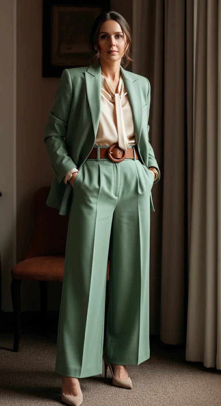 A tailored blazer provides a sharp silhouette. A soft, ivory silk blouse complements the ensemble beautifully.
