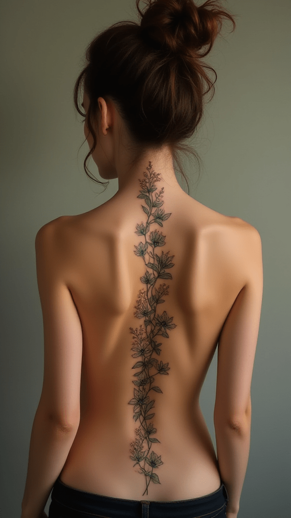 A botanical spine tattoo beautifully embodies nature’s elegance. It’s a unique and personal statement.