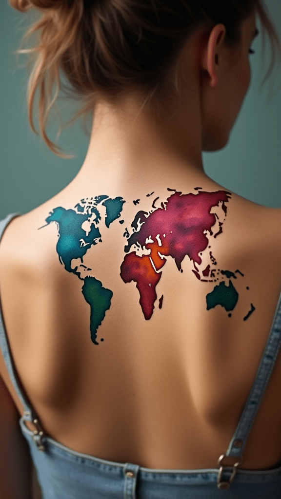 Express your passion for exploration with a stunning, watercolor world map tattoo.