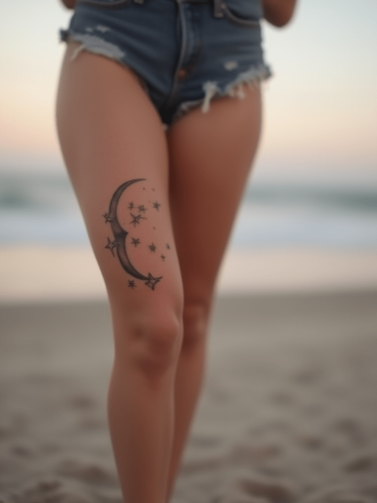 Transform your thigh into a mesmerizing nightscape with a celestial tattoo. This design showcases a delicate crescent moon surrounded by shimmering stars.