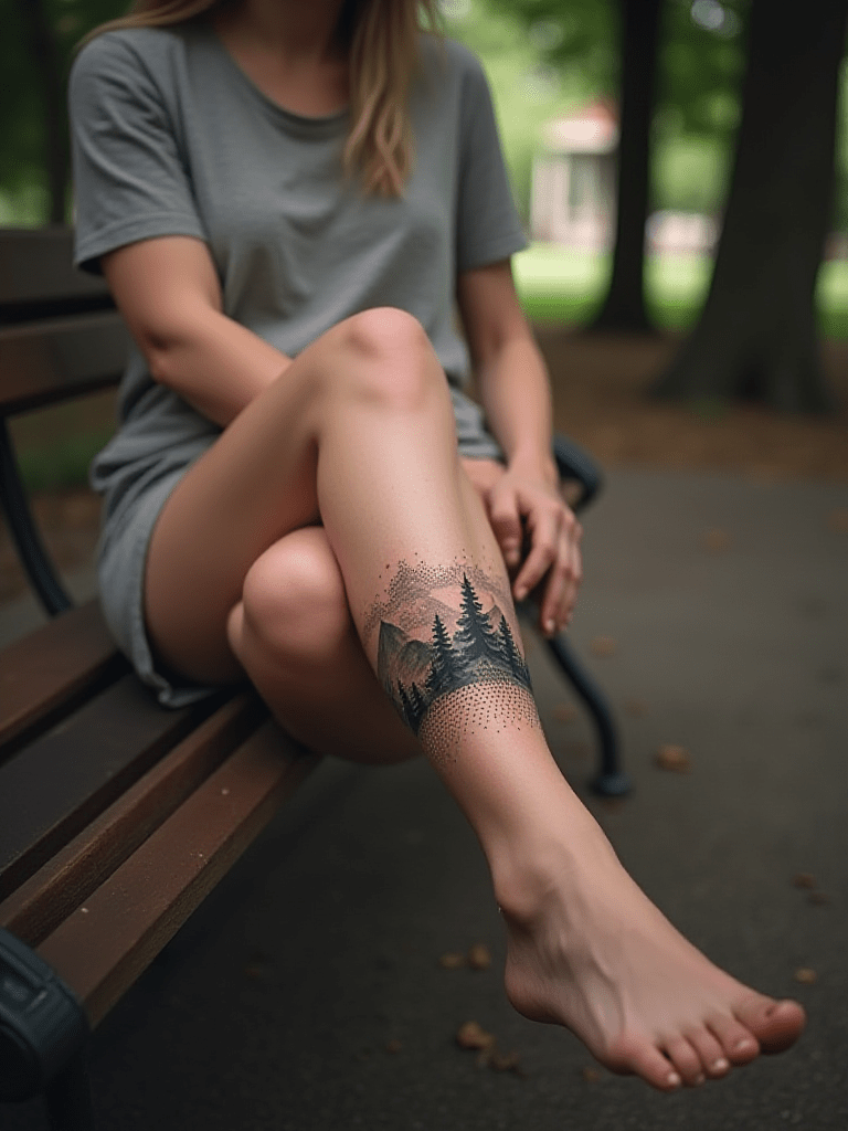 Embrace nature! Get a stunning dotwork landscape tattoo on your leg.